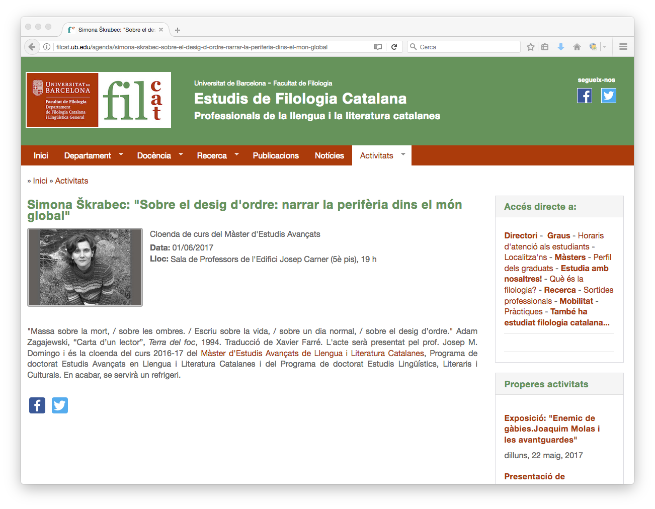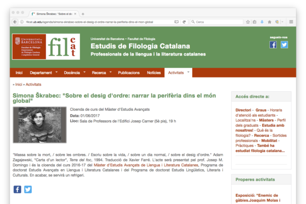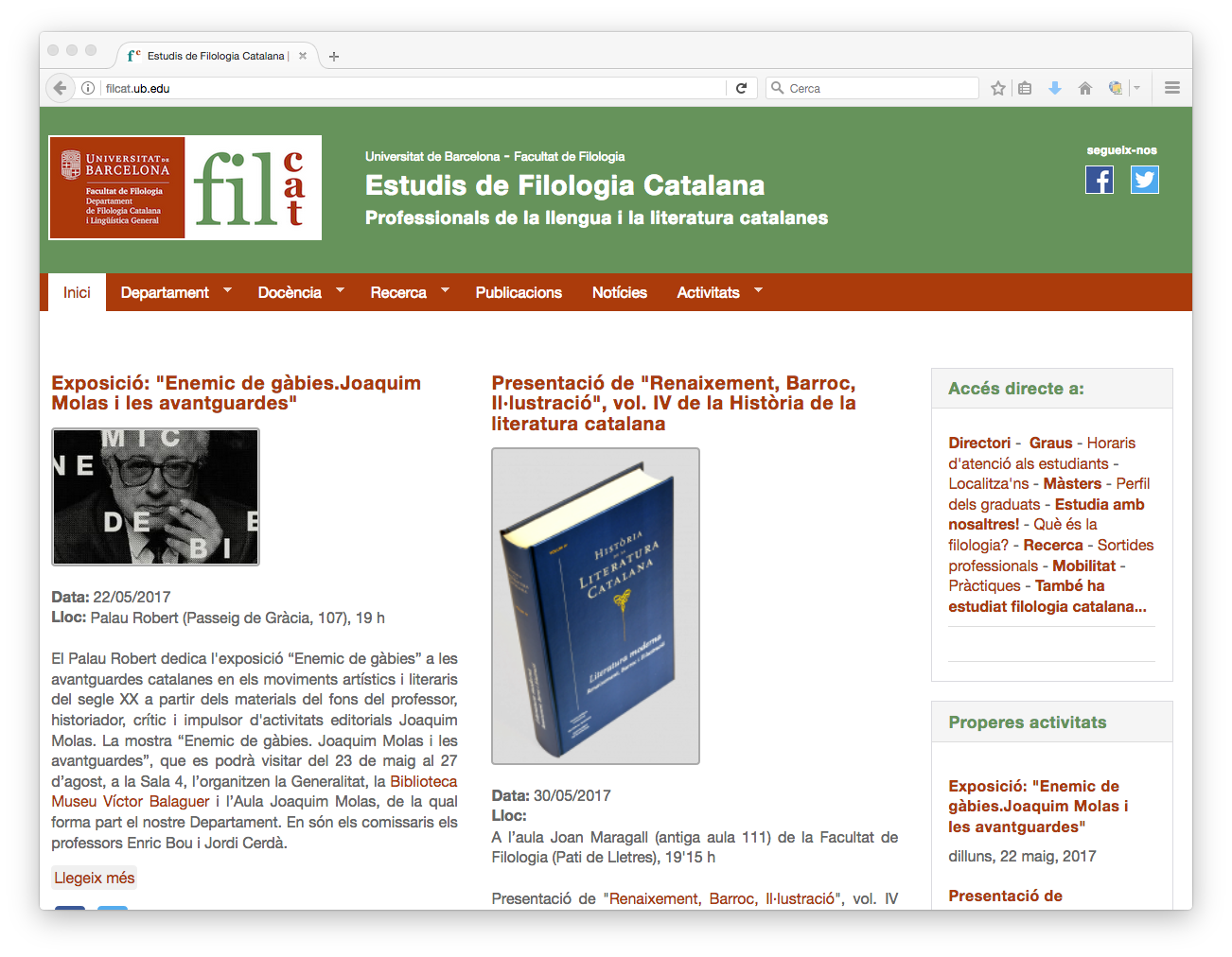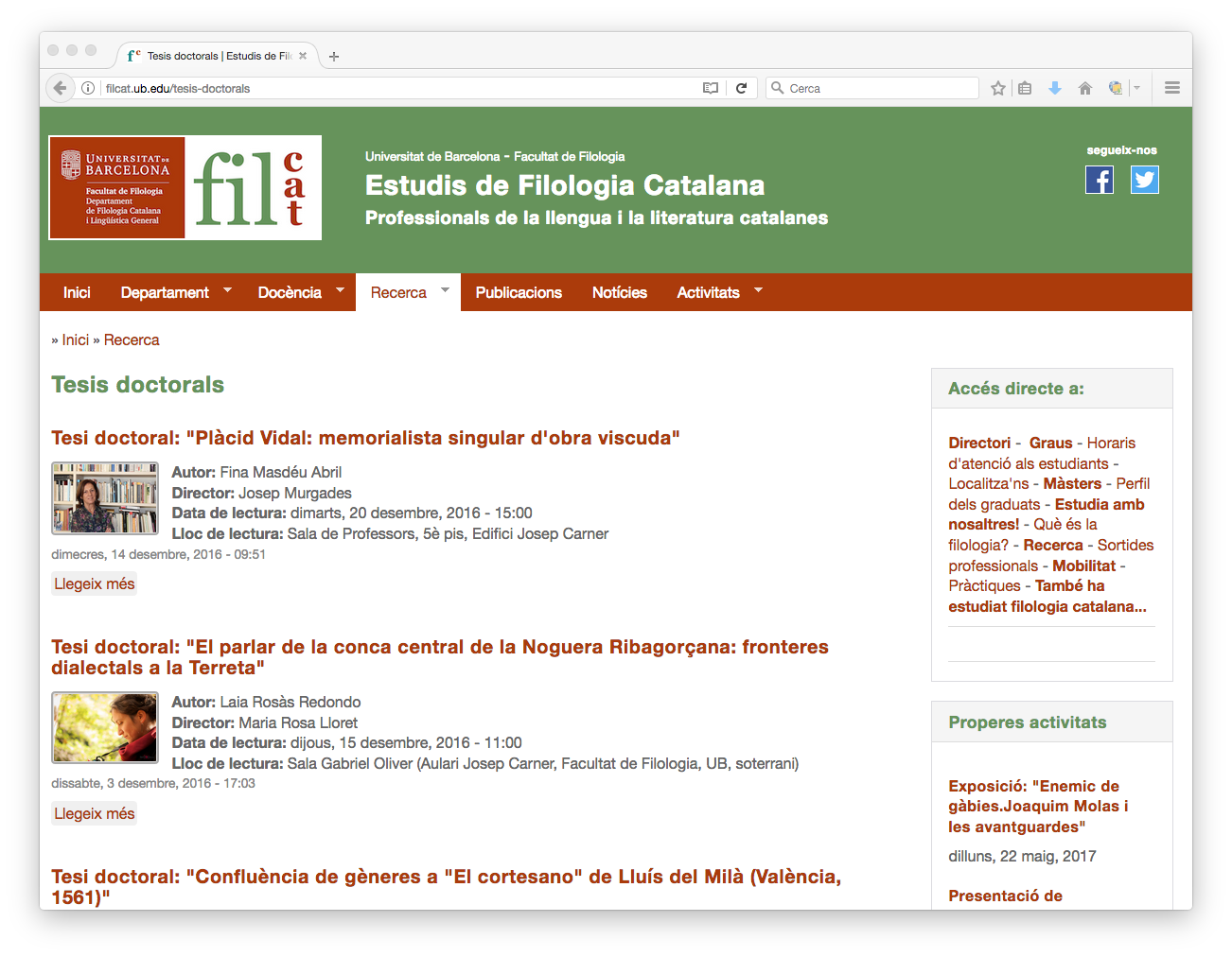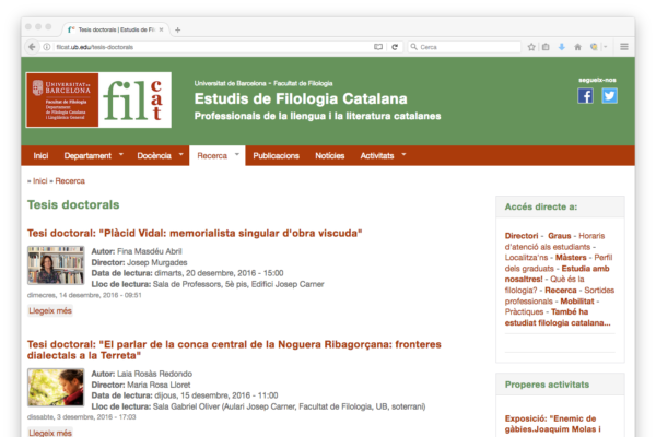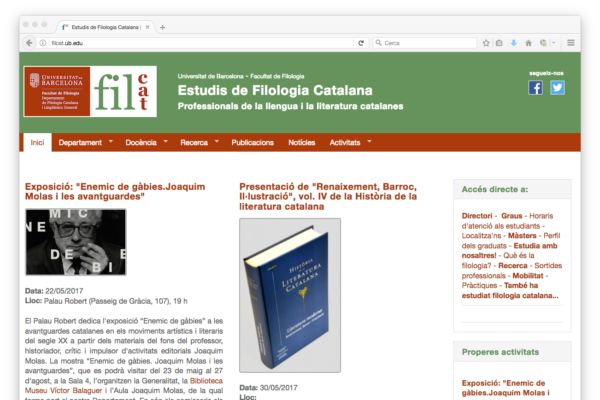 Toda la información relacionada con el directorio organizativo del Departamento de Filología Catalana, así como la producción que éste genera (publicaciones, tesis doctorales, grupos y proyectos de investigación…) y los actos y noticias del ámbito lingüístico y literario catalán, se encuentran recogidos en esta web. La complejidad del proyecto radica en posibilitar la relación de todo el contenido, por lo que toda la información esté entrelazada. Este hecho permite, por ejemplo, relacionar toda la producción departamental con los perfiles concretos de sus miembros, una gestión del contenido que es siempre ágil para quien se hace cargo de ella.