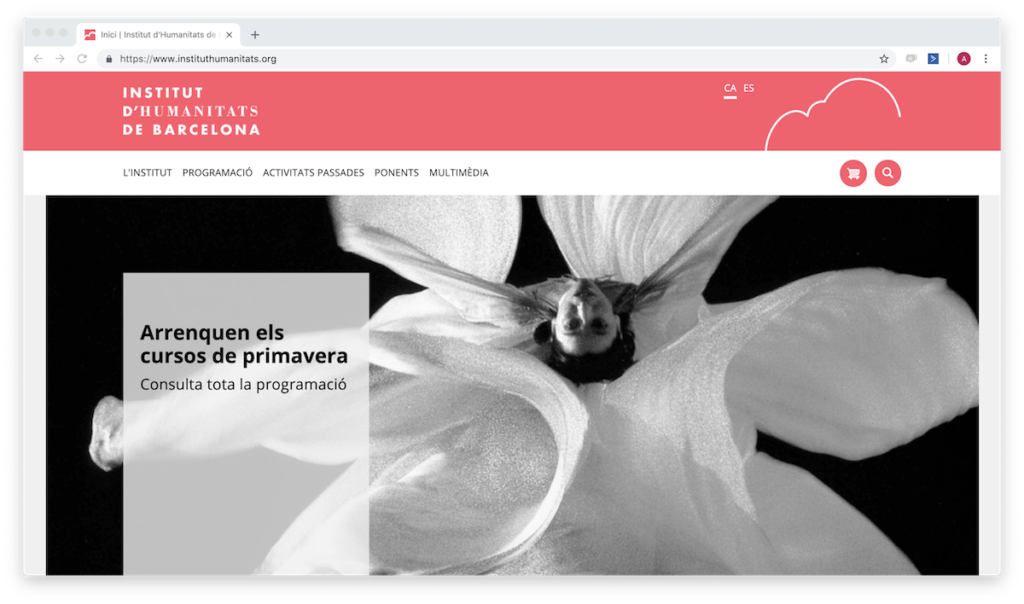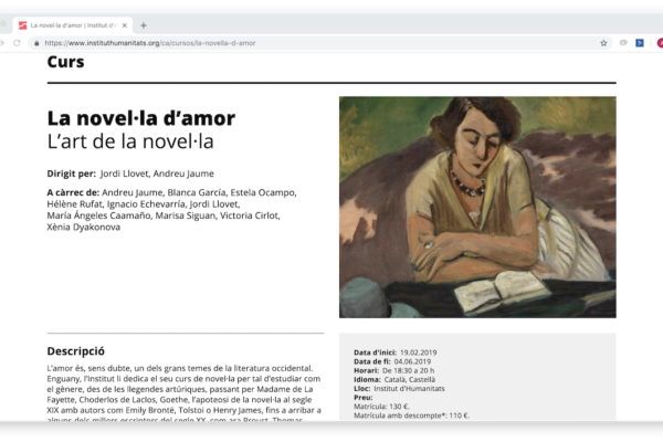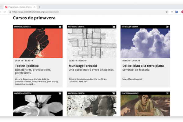 En este sentido, la programación de cursos, talleres y conferencias centran su actividad, una actividad que había que reflejar on line. De este modo, la web se convierte no sólo en el punto de información de esta programación, sino también en la plataforma de reserva de plazas para poder asistir a estas actividades. Es por ello, que la web incorpora una tienda on line adaptada a las necesidades del Institut d’Humanitats, la cual permite crear las matrículas de los alumnos y facilitar, entre otros aspectos, el proceso de control y seguimiento de estas, las plazas vacantes o el histórico de cursos a los que ha asistido cada alumno.
