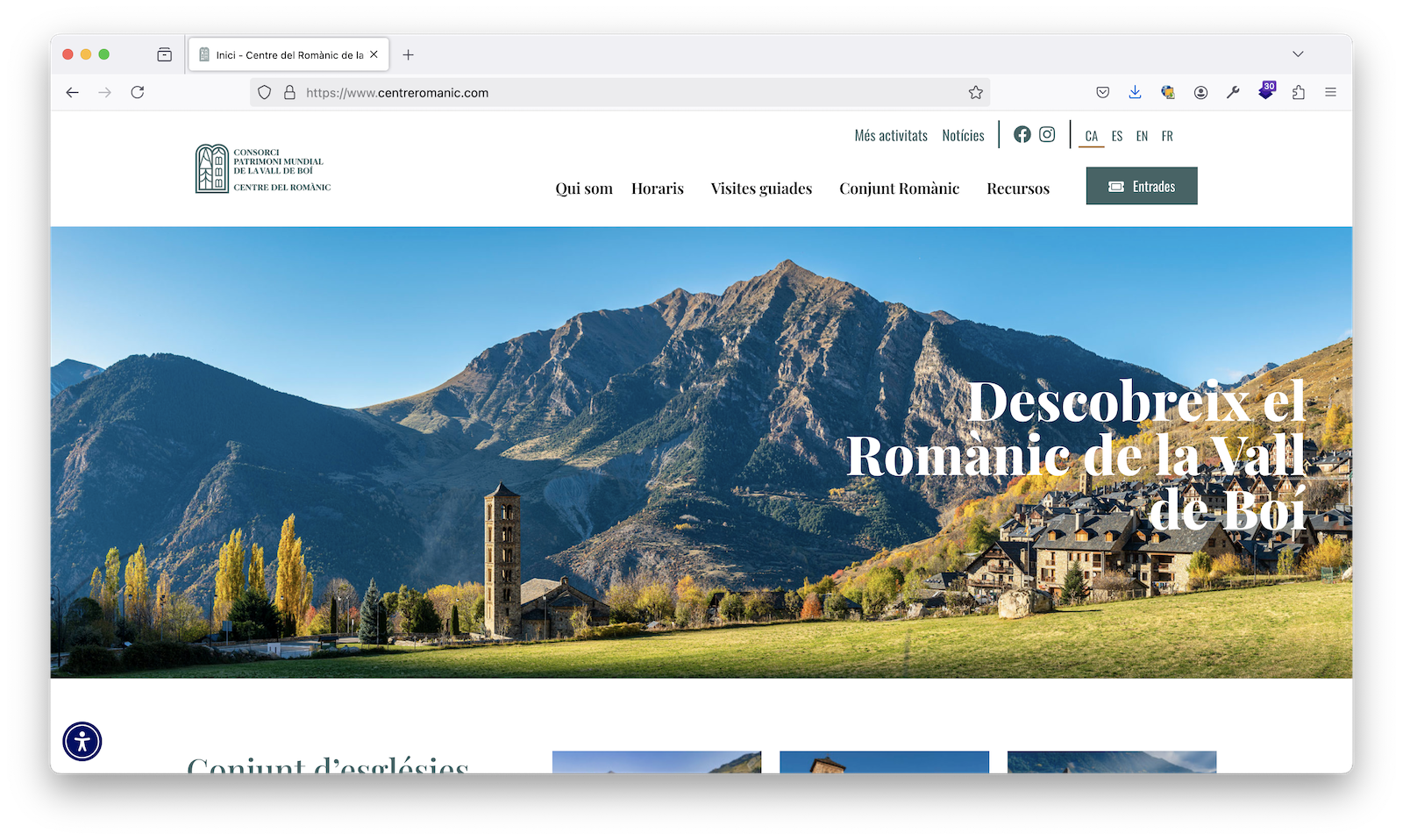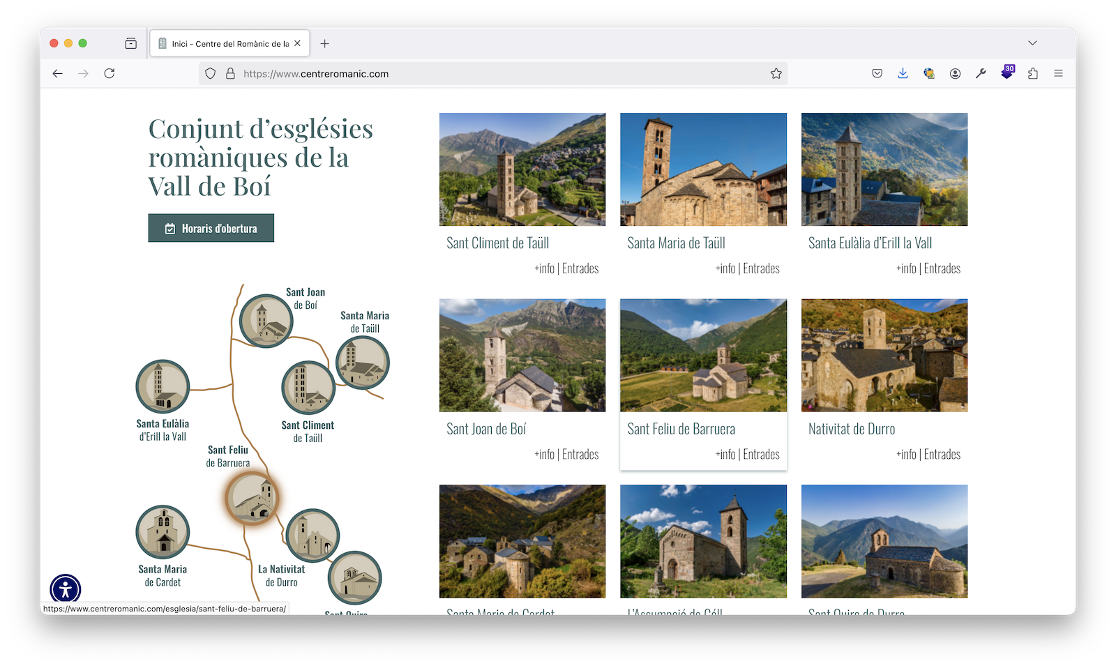 El web aplega informació sobre el conjunt romànic de la Vall de Boí, declarat Patrimoni de la UNESCO. Els continguts informatius i d’actualitat combinen textos, imatges, audiovisuals i mapes.
