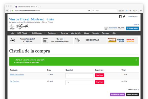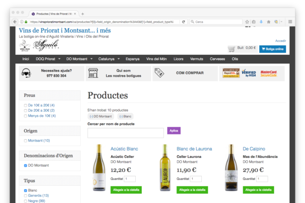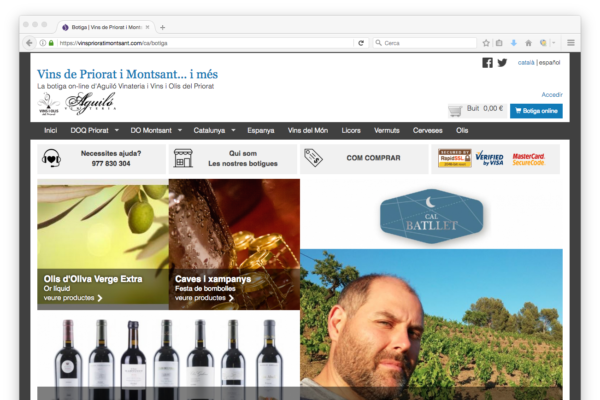Vinsprioratimontsant és una botiga online amb un ampli catàleg de vins, cerveses, licors i olis d’oliva. Amb tot, el client potencial pot trobar fàcilment el producte que està buscant, ja que el web proporciona un cercador i nombrosos filtres que permeten acotar la cerca de manera molt precisa.